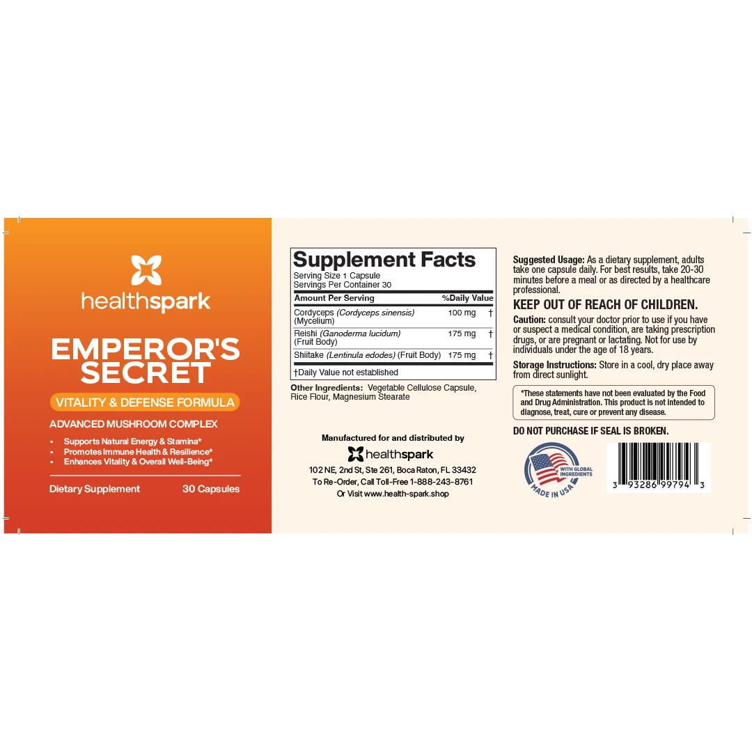 Emperor’s Secret is a premium vitality formula crafted from three revered mushrooms—Cordyceps, Reishi, and Shiitake—known for centuries as the “Elixirs of Life.” This ancient blend fuels stamina, strengthens immunity, and restores the body’s natural balance. Designed for men who value performance, longevity, and inner strength, Emperor’s Secret helps you live with energy worthy of your name.